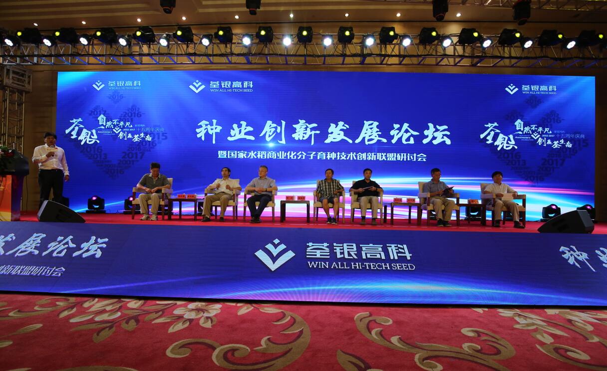 十五載風雨兼程,十五載春華秋實!2017年8月29日,科企合作戰略簽約儀式·種業創新發展論壇暨荃銀高科成立15周年慶典大會在合肥隆重舉行。農業部種子局局長張延秋,農業部科教司司長廖西元,中國科學院院士、國家基因研究中心主任、上海植生生態所所長韓斌,中國種子協會副會長兼秘書長蔣協新,安徽省科技廳廳長宛曉春,安徽省農業委員會副主任周世其、朱永東,“中國種業十大功勛人物”、荃銀高科創始人、安徽張海銀基金會理事長張海銀先生,以及來自農業部、中國種子協會和省、市有關部門的領導、專家、嘉賓,國家水稻商業化分子育種技術創新聯盟的科學家,戰略合作簽協單位代表,種業界同仁,還有來自印度尼西亞、孟加拉、巴基斯坦、越南等國家的20多位外賓朋友,計500多人參加了此次活動。