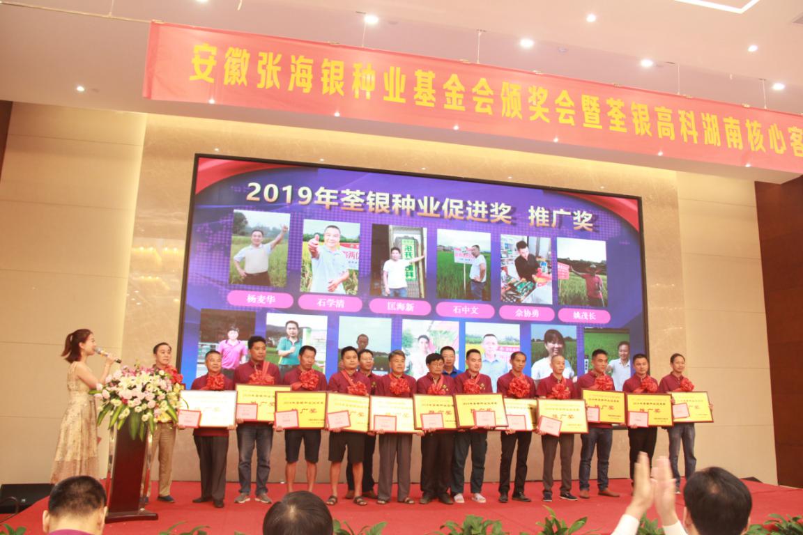 ?? ?隨后,張海銀種業基金會鄭滿生監事宣讀了張海銀種業基金會“荃銀種業促進獎”2019年頒獎決定文件。大會向38名在優質水稻推廣和良種服務等方面取得優異成績的個人頒發了“荃銀種業促進獎”專項獎。